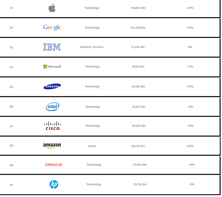 IT-компании в этом рейтинге традиционно лидируют: из первой пятерки общего рейтинга четыре компании – это Apple, Google, IBM и Microsoft. Стоимость бренда Google выросла за год на 15%, бренда IBM – упала на 8%. А бренды социальной сети Facebook и e-commerce-гиганта Amazon оказались среди Top Risers (компаний, цена бренда которых показала наивысшую динамику за год). Стоимость бренда Facebook за год выросла на рекордные 86% и достигла $14 млн, стоимость бренда Amazon поднялась на 25% до $29 млрд.